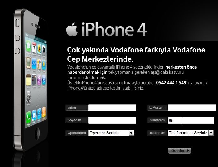 Kayıt için kullanıcılardan ad, soyad, e-posta adresi, telefon numarası, mevcut operatör ve telefon modeli gibi bilgiler isteniyor. Anlaşılan Vodafone farklı mobil operatörden servis alanlara numara taşıma olayı karşılığında iPhone 4 sahibi olma fırsatı sunacak. Kayıt bırakanlar iPhone 4 satışa çıktığında 0542 444 1 549 numaralı telefonu arayarak yeni telefonlarını alabilecek.