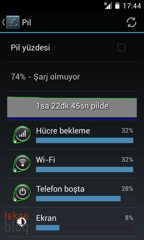 Şarj işlemi yukarıda da belirttiğimiz gibi microUSB portu üzerinden gerçekleştiriliyor. Ekranın hemen üstünde yer alan küçük bir LED lambası sayesinde cihazın şarj edildiği belli oluyor. Şarj işlemi bittiğinde daha önce turuncu olan renk yeşile dönüyor. Daha üst sınıf Android telefonlarında gördüğümüz pil tasarruf modlarını Vodafone Smart 4 mini’de görmüyoruz. Bu durumda pil tasarrufu için sizin bir şeyler yapmanız gerekiyor. Ekran parlaklığını kısabilir veya veri iletişimini kapatabilirsiniz.