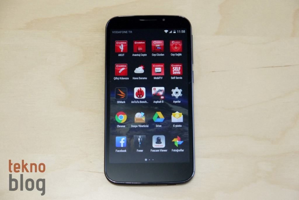 Ana ekranda yer alan Vodafone klasörü içinde telefonda yüklü olan Self Servis, Avantaj Cepte, AKUT, Cep Cüzdan, MobilTV, Çiftçi Kılavuzu ve Cep Sağlık gibi Vodafone uygulamalarının kısayolları bulunuyor. Öte yandan yine ana ekrana yerleştirilmiş Google klasörü içinde de Google’ın telefonda yüklü olarak sunulan Chrome, Gmail, Google+, Haritalar, Google Play Müzik, Google Play Gazetelik, Drive gibi uygulamaları da mevcut. Ayrıca bunlar dışında Dosya Yöneticisi, Fener gibi araçlar da yer alıyor.