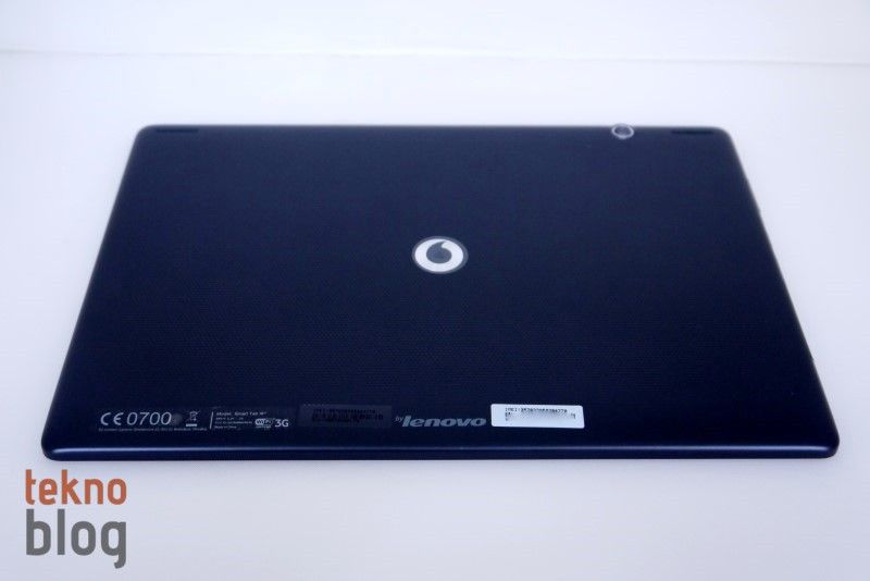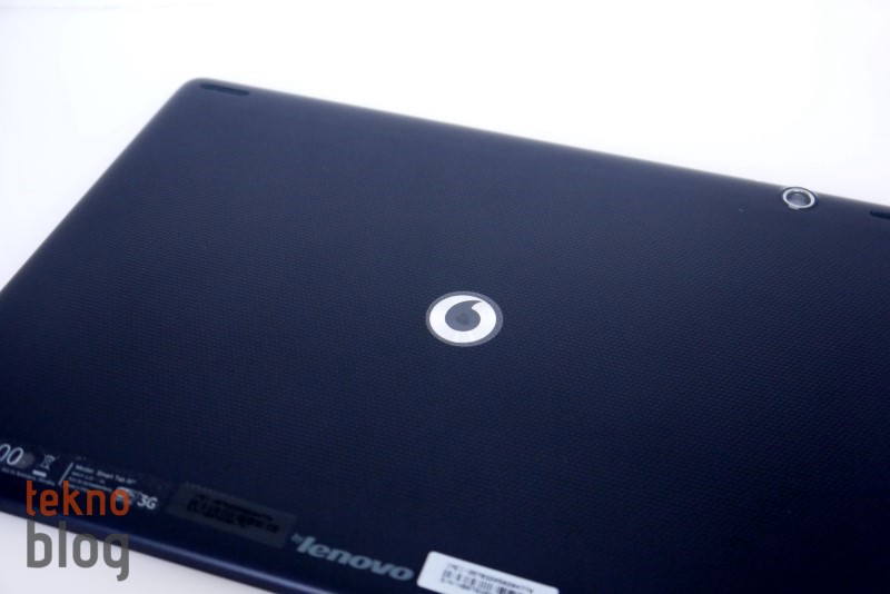 Tabletin noktalı dokularla kaplı plastik arka yüzeyinin ortasında Vodafone’un logosu yer alırken, bu logoyla aynı dikey doğrultuda, altta tabletin üreticisi olan Lenovo’nun logosu dikkat çekiyor. 5 megapiksel kameraysa hemen üst kenarla buluşma noktasında, arkadan bakıldığında sağa doğru yanaşık şekilde yerleştirilmiş. Hoparlörler de kamerayla aynı doğrultuda, sağ ve sol kenarlara yakın şekilde konumlandırılmış.