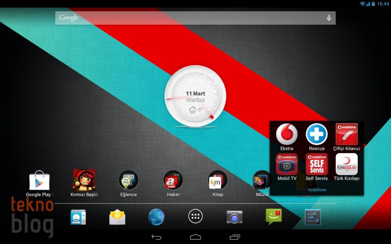 Tabletin ana ekranına girdiğinizde karşınıza Vodafone’a özel, analog saat görünümlü, içinde tarih, konum ve hava durumu bilgilerinin de yer aldığı şık bir bileşen çıkıyor. Aynı giriş paneli içinde Google Play uygulama mağazasının kısayolu dikkat çekiyor. Kırmızı Başlıklı Kız ve Smugglers oyunlarının kısayolları da ana ekranın birinci paneline eklenmiş.