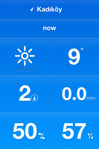 Tekrar uygulamanın ana ekranına dönmek içinse bu sefer baş ve işaret parmaklarıyla yakınlaştırma hareketi yapılıyor. Ana ekranın en üst kısmında hava durumu görüntülenen yeri yazarken, hemen altındaki bölümdeyse gösterilen hava durumu bilgilerinin ne zamana ait olduğu yazıyor. Ekranın kalan kısmındaysa kutucuklar yer alıyor. Bu kutucuklarda o anki hava durumu, sıcaklık, rüzgar yönü ve hızı, yağış miktarı, bulutlluluk oranı ve nem oranı yer alıyor. Bu bilgilerin yer aldığı kutucuklarda o ana ait bilgiler yer alıyor. Ancak kutucuklara dokunulduğu zaman günün farklı zaman dilimlerine ait bilgi ve tahminler de görülebiliyor.