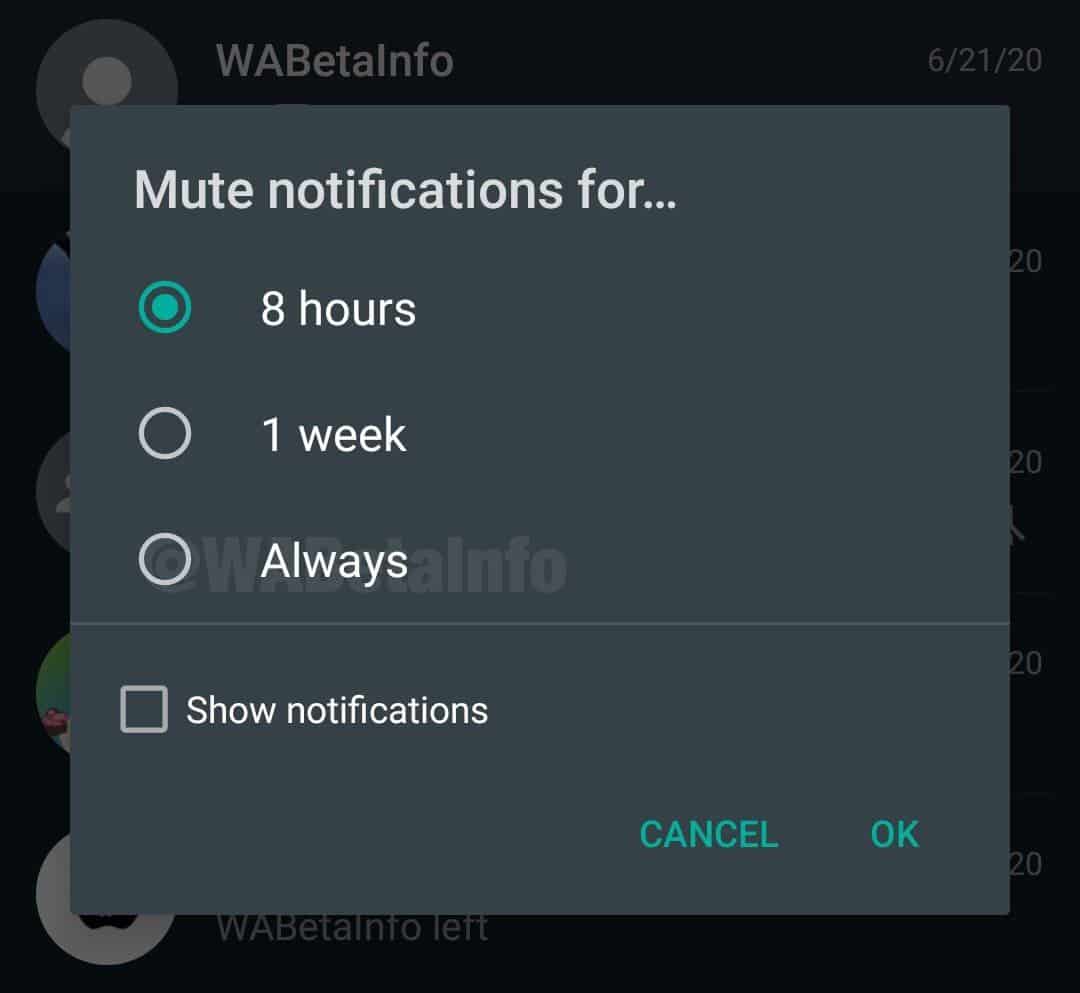 WhatsApp’ın gelecek sürümleriyle ilgili sızıntılarıyla bildiğimiz WABetaInfo sitesi, bu yeni eklentiyi fark etti. Uygulamanın 2.20.201.10 numaralı versiyonunda her zaman sessize al seçeneğinin eklendiği görülüyor. Aslında bazı kullanıcılar WhatsApp’ın daha erken sürümlerinde de bu seçeneği gördüğünü belirtiyor. Bu durum da yapılan güncellemenin uygulama sürümüne bağlı olmadığını, daha çok sunucu taraflı güncelleme olduğunu işaret ediyor.