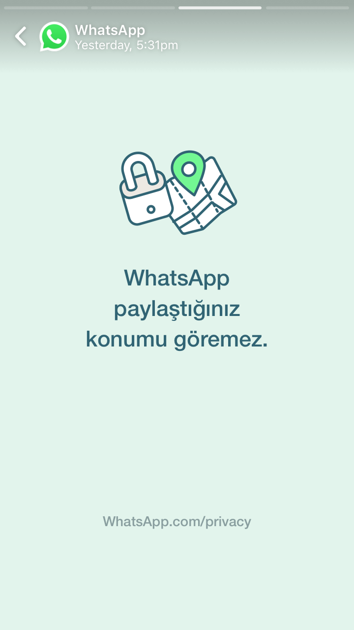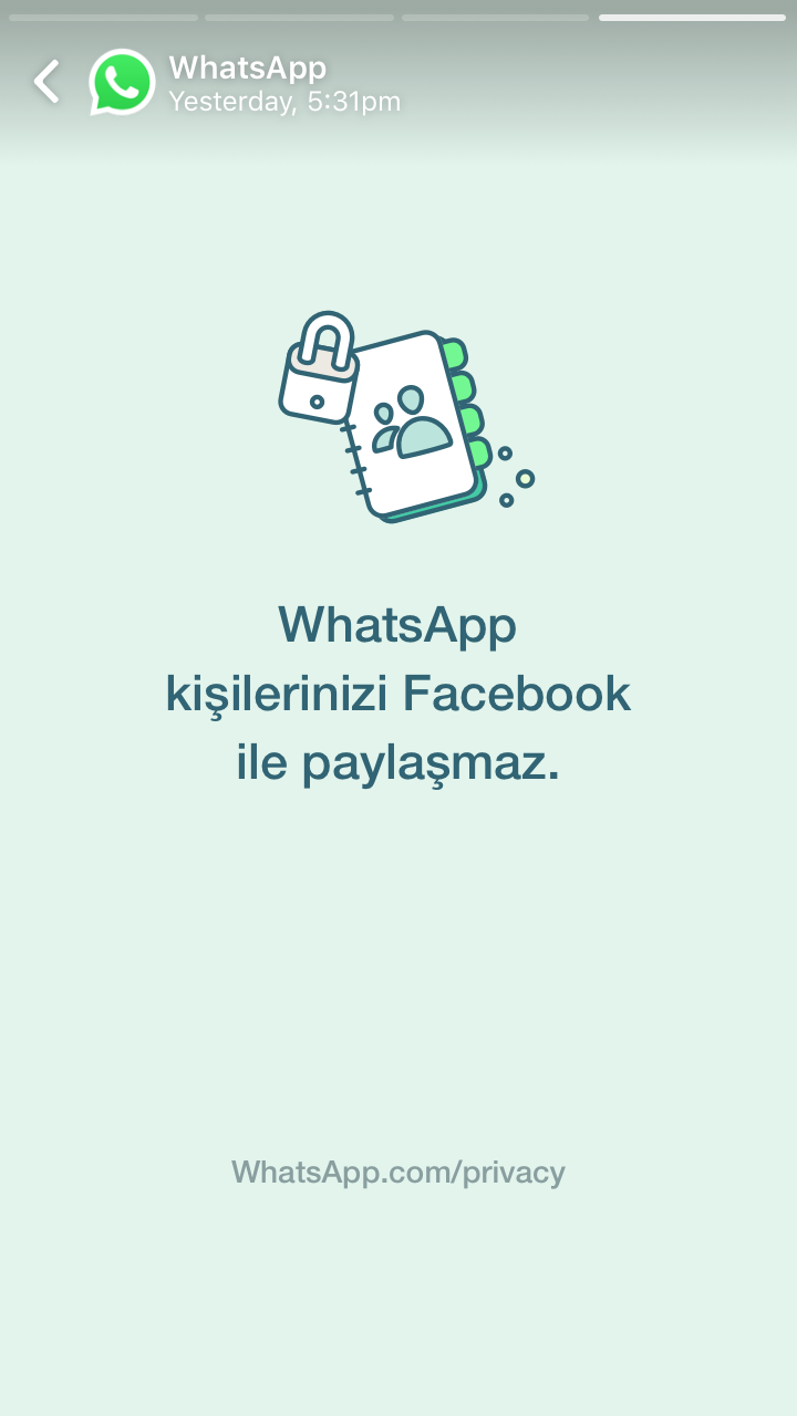 Öte yandan WhatsApp, “Gizlilik Politikamız hakkında paylaştığımız son güncellemeden bu yana Türkiye’deki kullanıcılarımızdan birçok soru aldık ve bu soruları yanıtlamak istiyoruz. Bu sabah itibariyle Türkiye?deki kullanıcılarımıza, WhatsApp’ın ve Facebook?un mesajlarınızı göremediğini tekrar teyit eden özel bir durum mesajı göndermeye başlıyoruz.” açıklamasında da bulundu.