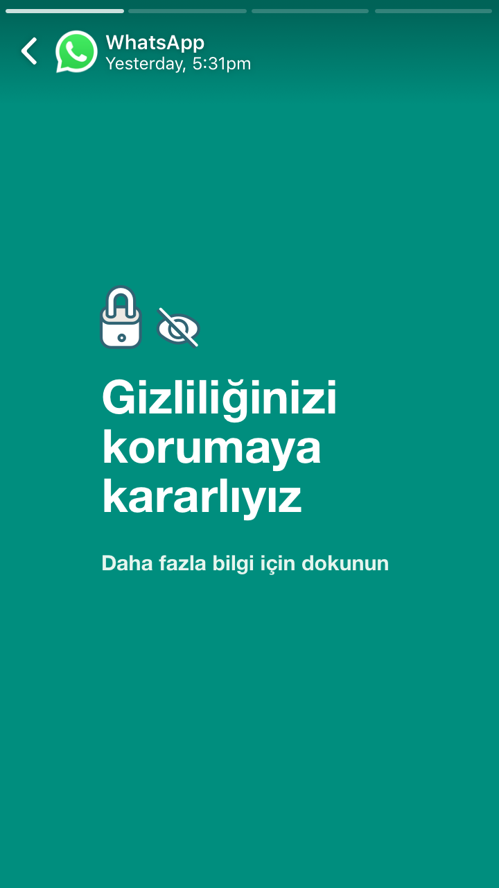 WhatsApp bu sabah Türkiye’deki kullanıcılarının uygulama ekranlarında özel bir duyuru yayınlayarak, Hizmet Politikası ve Gizlilik Kuralları ile ilgili olarak yaptığı bilgilendirmeyi tekrar hatırlattı. WhatsApp üzerinden gösterilecek hikâyeler sayesinde gizlilikle ilgili ana mesajlar kullanıcılara veriliyor.