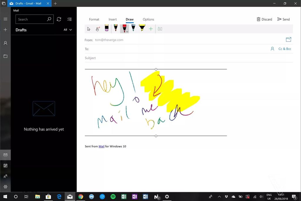 Windows Insiders kullanıcıları en son sürüm Mail uygulamasında bu yeni desteği test edebiliyor. Yeni bir e-posta iletisi yazmak istediğinizde, şerit arayüzü içine eklenmiş çiz sekmesini göreceksiniz. Birçok kalem ve renk seçeneği sunulan bu özelliğin Redstone 5 kod adıyla anılan gelecek büyük Windows 10 güncellemesiyle birlikte tüm kullanıcılara ulaştırılması bekleniyor. Microsoft’un söz konusu güncelleştirmeyi eylül ayında yayınlayacağı tahmin ediliyor. Şirket, şu sıralar bu güncellemede sunmayı planladığı işlevlere son hâlini vermekle uğraşıyor.
