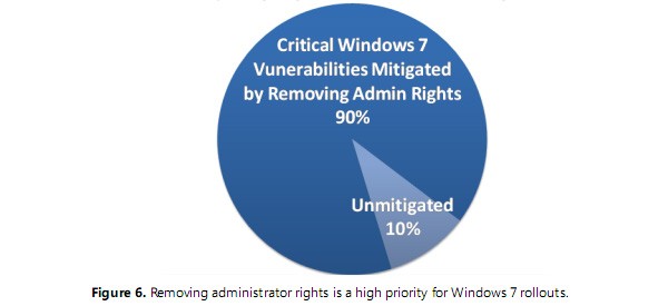 Yukarıdaki yargıya BeyondTrust’ın yaptığı araştırmanın sonucunda varıyoruz. Söz konusu şirketin “imtiyazlı erişim yönetimi” yazılımları satması böyle bir sonucun ortaya çıkmasında etkili olabilir. Çoğumuz Windows 7’yi yönetici haklarıyla kullanıyoruz ve şimdiye kadar ciddi bir sıkıntıyla karşılaştığımızı söyleyemeyiz. Ancak BeyondTrust’a hak veren ve kullanıcılarının bilgisayarlarındaki haklarını kısıtlayan birçok şirket bulunuyor. Hazırlanan rapor Microsoft’un 2009 yılındaki açıklarına yakından bakıyor. Rapor edilen 55 Microsoft Office açığı ve listelenen 33 IE açığından yüzde 94’ü standart bir kullanıcı hesabıyla basit bir şekilde önlenebiliyormuş. Daha iyi bir güvenlik yazılımı kullanarak da bu sorunların önüne geçmek mümkün. İlgilenenler yazının devamındaki bağlantıdaki PDF dosyasına göz atıp daha ayrıntılı bilgi alabilirler.