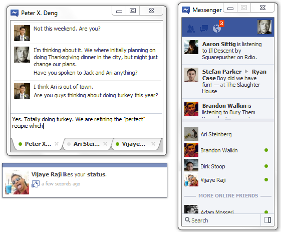 Facebook, Windows 7’ye özel yeni bir Facebook Messenger masaüstü eklentisini kısıtlı sayıda bir kullanıcı grubuna denetmeye başladı. Bu yeni masaüstü işlemci Facebook Sohbet, Facebook Ticker beslemesi ve durum güncelleme bildirimlerine erişim sağlıyor. Facebook bu hamlesiyle kullanıcıların gerçek zamanlı işlevleri web sitesine gelme zahmetine girmeden de kullanma imkânı sağlamayı hedefliyor. Ayrıca bu masaüstü istemci Facebook’a Windows Live Messenger benzeri bir hava da katacak, onu biraz daha anında mesajlaşma servisi şekline sokacak.