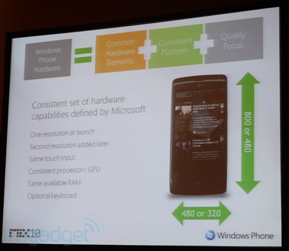 MIX10’da konuşan Microsoft yöneticisi Charlie Kindel, WP7S’in 800 x 480 çözünürlüğü destekleyeceğini açıkladı. Ancak bu durum sadece başlangıç aşamasında geçerli olacak. Gelecekte henüz belirlenmeyen bir tarihte 480 x 320 çözünürlük desteği de sunulmaya başlanacak. Bu arada tüm cihazlar için aynı miktarda uygun RAM ve aynı oranda kapasitif dokunmatik ekran yeteneği sunacak.