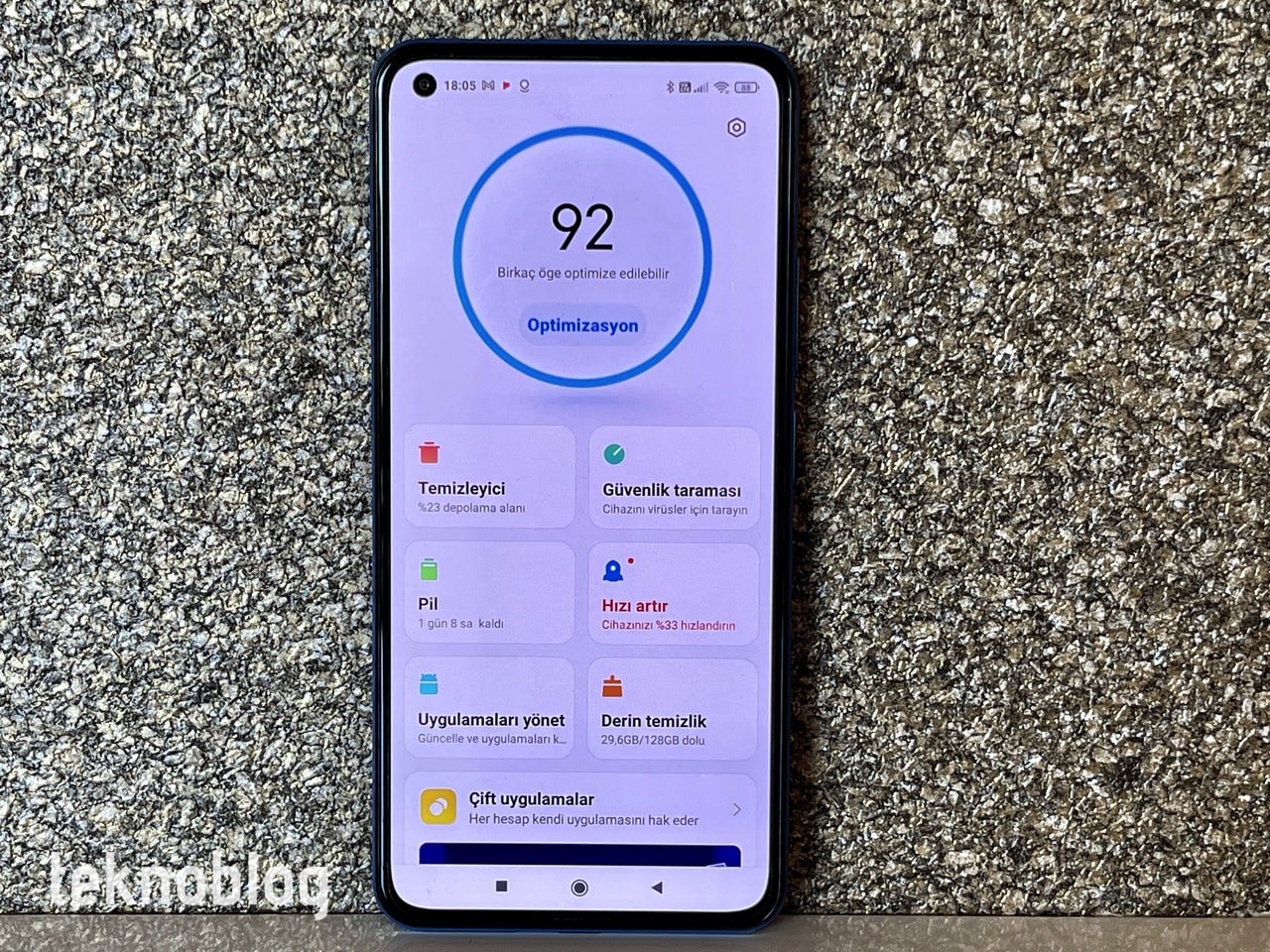 Ana ekranda görebileceğiniz Güvenlik uygulaması, Xiaomi Mi 11 Lite’ınızın performansı veya diğer unsurları üzerinde kontrol imkanını veriyor. Depolama alanını temizleme, hızı artırma, derin temizlik yapma, pil durumunu görme ve güç tasarruf modunu açma gibi özellikleri ve ayarları bu uygulama içinde bulabilirsiniz. Veri kullanımını görme, iş ve özel hayatta kullanım için telefonun içinde iki farklı alan yaratma, uygulamalara kilit koyma, WhatsApp ve benzeri uygulamalar için çift profille kullanımı ayarlama gibi işlevleri de Güvenlik uygulamasında bulabilirsiniz.