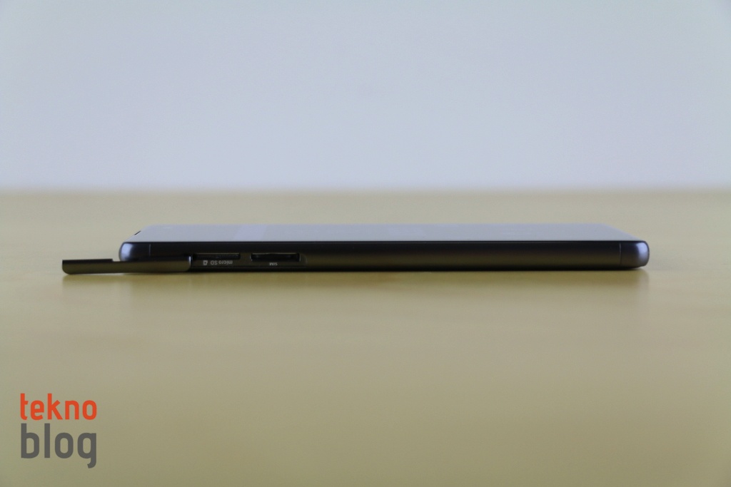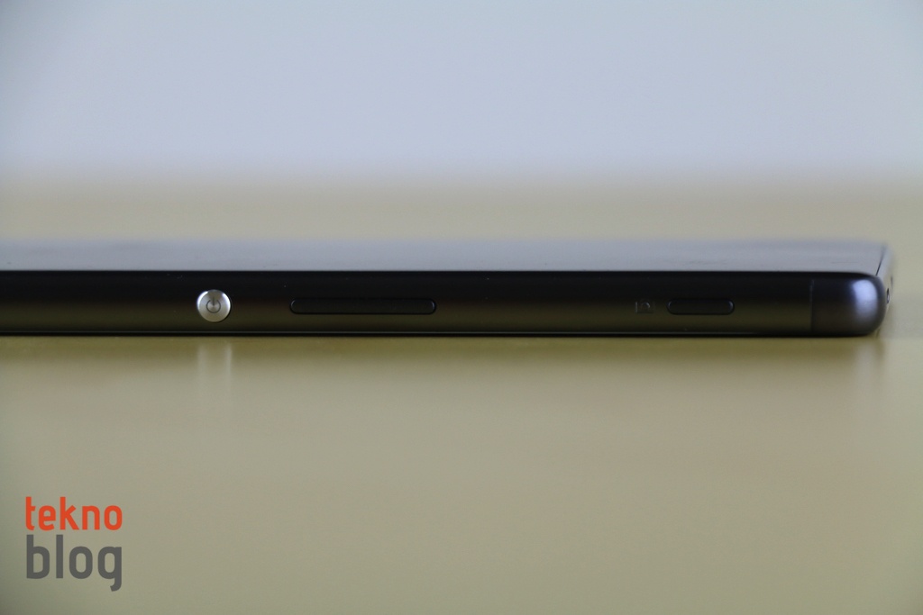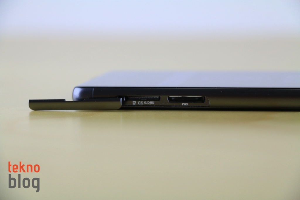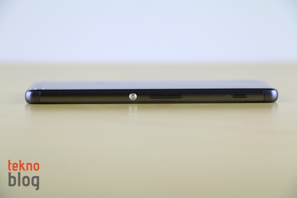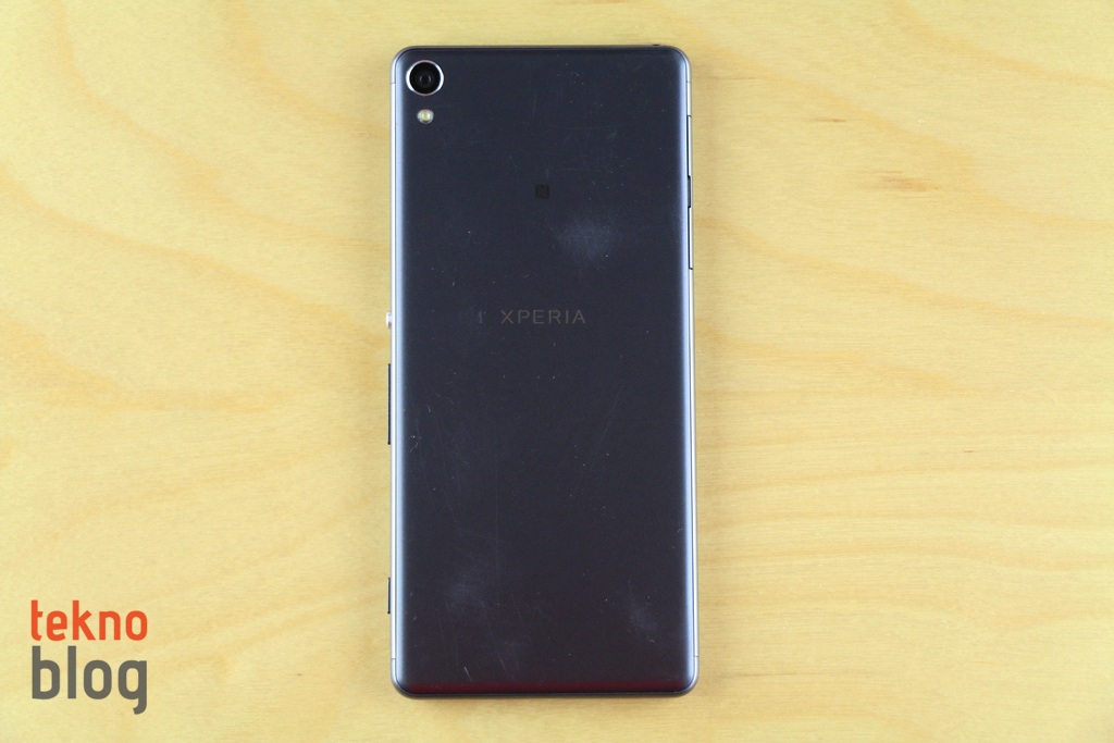 Karşı kenarda, bir kapak arkasında nanoSIM ve microSD kart yuvalarını görüyoruz. Alt kenarda microUSB portu, ana mikrofon ve hoparlör bulunurken, karşı gelen üst kenarda da ikinci mikrofon ve 3.5 mm. kulaklık jakını görüyoruz. Arka yüzü kaplayan polikarbon plaka, ön tarafta olduğu gibi kenarlara doğru hafif kavis yapan bir yapıya sahip. Bu da telefonun simetrik bir görünüm kazanmasına katkıda bulunuyor. Bu plaka sabit, yerinden çıkarılamıyor. Yumuşak bir yüzeye sahip, ancak bu yüzey çizilmelere ve aşınmalara karşı epey dayanıksız gibi görünüyor. Öyle ki, elimize gelen test ürünü daha en baştan birçok küçük çizikle doluydu. 13 megapiksel kamera, sol üst köşede, ilk bakışta rahatlıkla dikkat çekecek şekilde duruyor. Hemen altında da LED flaşı görüyoruz. NFC işareti ve XPERIA markası da arkada yer alan diğer tasarım unsurları olarak dikkat çekiyor.