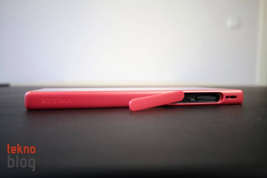 Telefonun sol kenarında Xperia logosunu üste doğru yerleştirilmiş şekilde görüyoruz. Aynı kenarın alt tarafına doğru, bir arka kapak arkasına yerleştirilmiş microSD ve nanoSIM kart yuvalarını görüyoruz. Alt kenara baktığımızda microUSB portun ortalanacak şekilde yerleştirildiğini görüyoruz. Bu port hem şarj hem de veri transferi için kullanılıyor. Onun hemen yanına ana mikrofon yerleştirilmiş.