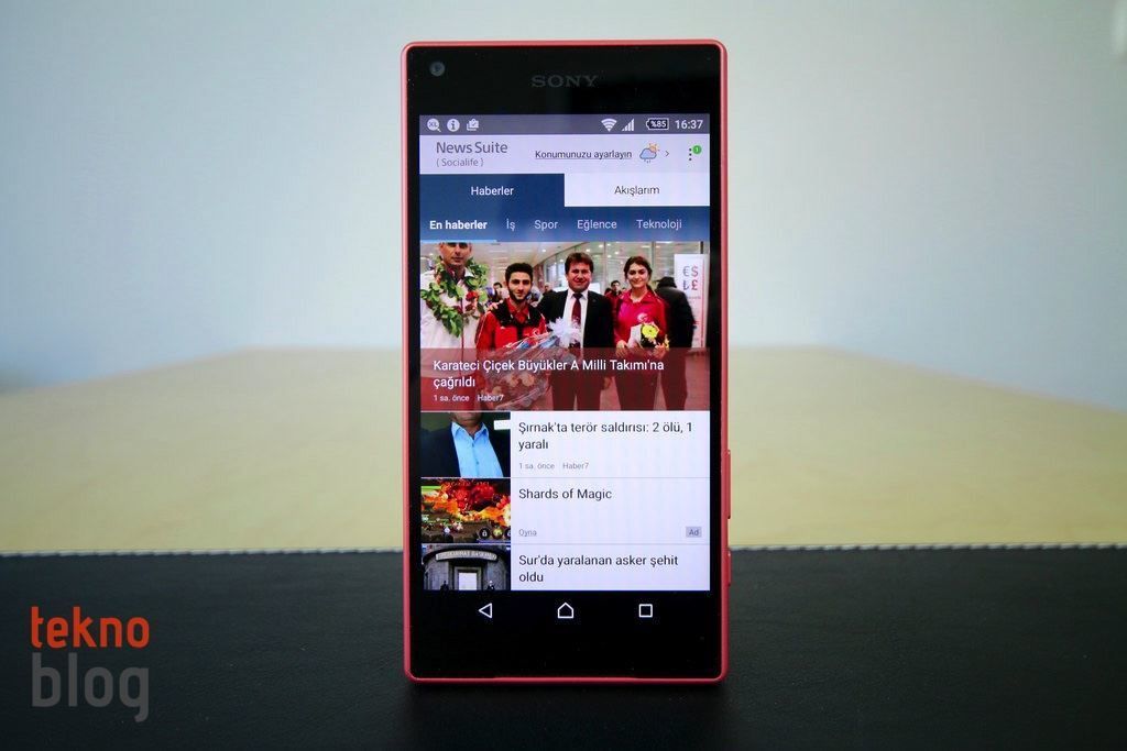 Öte yandan bazı Sony uygulamalarını da görüyoruz. SocialLife uygulaması yenilenmiş ve NewsSuite adında bir haber uygulamasına dönüşmüş. Burada seçilmiş haber kaynaklarından derlenen haberleri görebileceğiniz gibi RSS aracılığıyla kendi kaynaklarınızı da ekleyebilirsiniz. Lifelog adlı fitness takip uygulaması da özellikle uyumlu akıllı bilekliklerle kullanıldığında kalori, adım gibi değerleri kayıt altına almayı sağlıyor. Smart Connect uygulaması kulaklık, şarj aleti gibi Z5 Compact’a bağlanan cihazlara göre otomatik olarak atanmış görevler tanımlamaya izin veriyor.