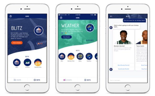 Blitz adını taşıyan bot sayesinde kullanıcılar fantezi Amerikan futbolu takımlarına gerekli müdahaleleri yapabiliyor. Yahoo, Bots bünyesindeki sanal asistanlarının sayısının önümüzdeki dönemde artabileceği belirtiliyor. Ücretsiz olarak yayınlanan uygulama şu an için Türkiye’den indirilemiyor.