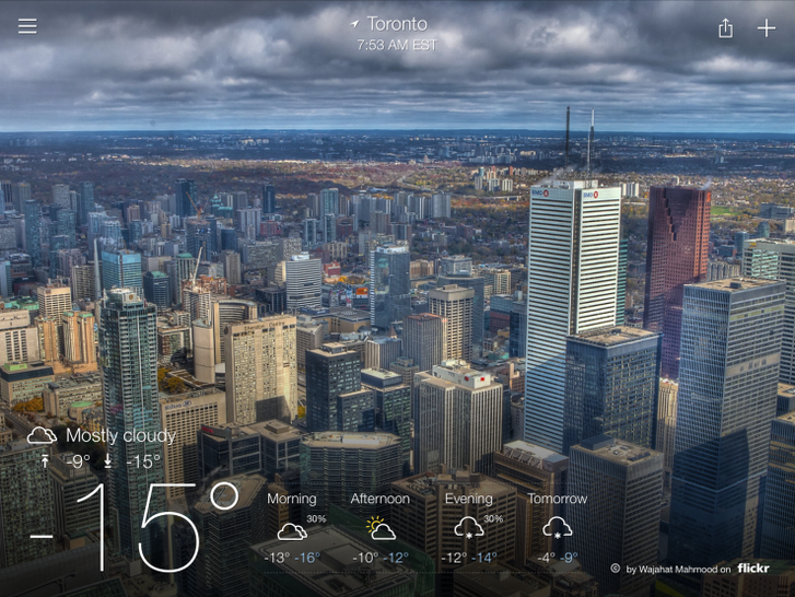 iOS için Yahoo Weather uygulamasında hava durumu bilgisi verilirken arka planda Flickr görsellerinin kullanılması uygulamanın beğeni toplamasındaki en önemli faktörler arasında yer alıyor. Söz konusu görsellerin o anki hava durumuna bağlı olarak seçilmesi de ayrıca dikkat çekiyor. Saatlik ve günlük hava tahminlerini, rüzgar hızını, yağış ihtimalini gösteren uygulama interaktif animasyonların da bulunduğu etkileyici bir arayüze de sahip. Pek çok kullanıcının iOS’in yerel hava durumu uygulamasından daha çok beğendiği Yahoo Weather uygulamasının iPad versiyonunu ilgili kısmındaki bağlantı aracılığıyla indirebilirsiniz.