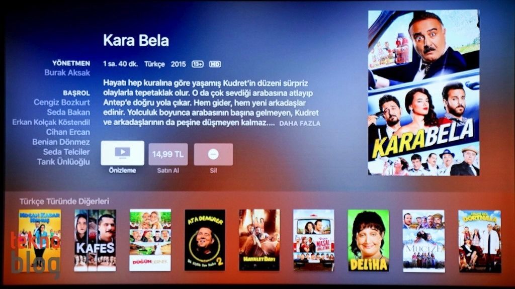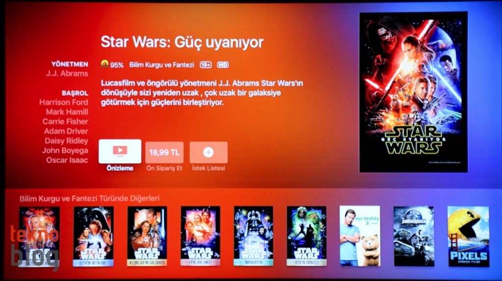 iTunes Store tarafında yeni Apple TV’de değişen çok fazla bir şey yok. Apple’ın film satın alma ve kiralama ve bunları Apple TV’de izleme imkanı sunan hizmeti daha önceki nesil ürünlerde sunduğundan farklı bir deneyim sunmuyor. iTunes Store’un tasarım şablonu fazla değişikliğe uğramıyor, sadece görsel açıdan daha renkli ve çekici bir tasarım karşımızda duruyor. Filmlerin detay sayfalarında bulanık arka planların fazlasıyla kullanıldığını görüyoruz. Her bir filmin detayları, ilgili filmler, kullanıcı yorumları film sayfaları içinde gösteriliyor.