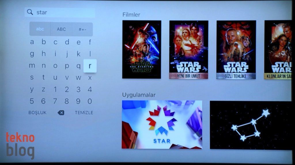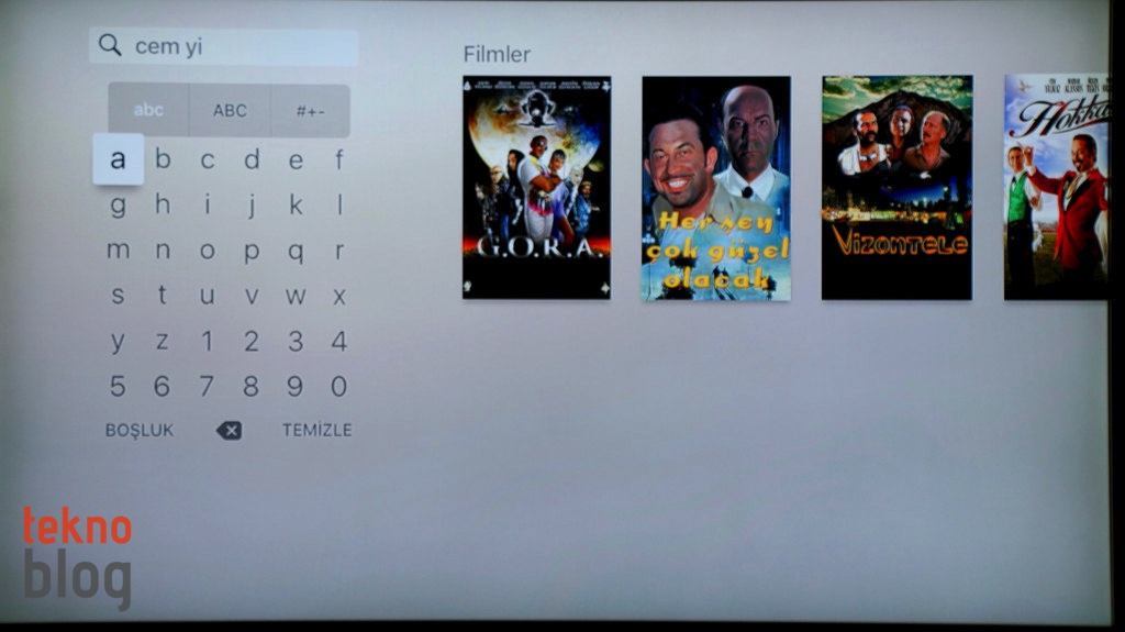Aslına bakarsanız, yeni Apple TV’nin en önemli farkı Siri’nin yoğun şekilde entegre edilmiş olması ve içerik aramalarında sesli komutların yardımıyla bunu iyice zahmetsiz bir hâle getirmesi. Ancak Siri desteği şu an için Türkiye’de sunulmuyor. Bu da Apple TV üzerinde içerik aramalarının daha kısıtlı imkanlarla, biraz daha geleneksele yakın şekilde gerçekleştirilmesi anlamına geliyor. Arama yapmak için metin girişi yapmanız gerekiyor, bunun için de ya Apple TV’nin sanal klavyesini ya da iOS Remote uygulamasını kullanacaksınız. Siz aradığınız metni girmeye başladıkça iTunes veya App Store’dan içerik veya uygulama tavsiyeleri ekrana düşmeye başlayacaktır.