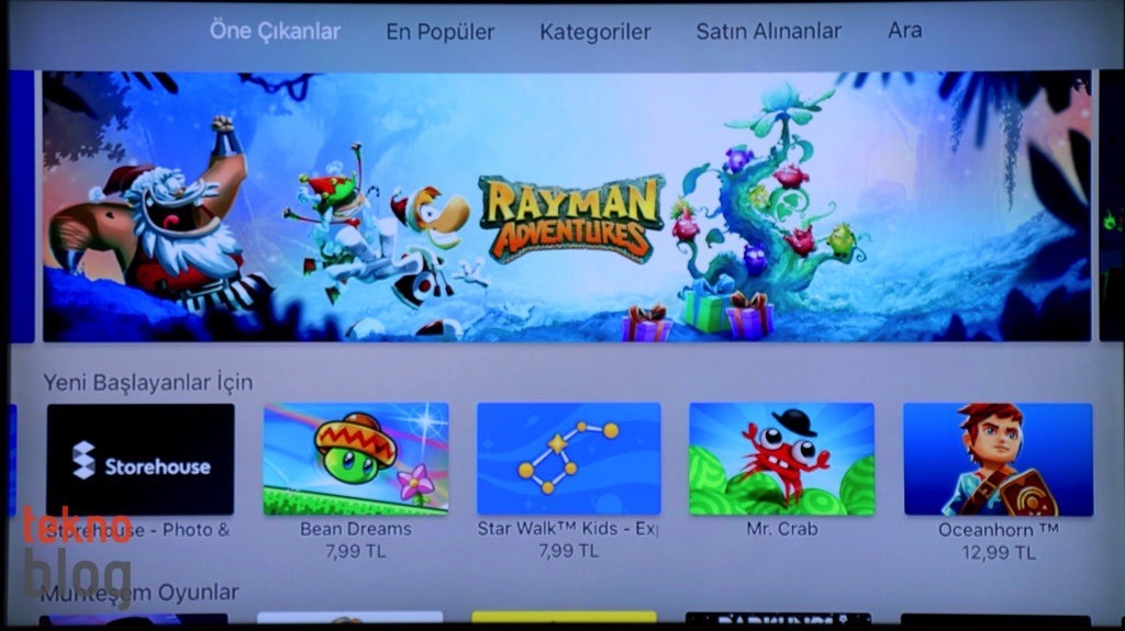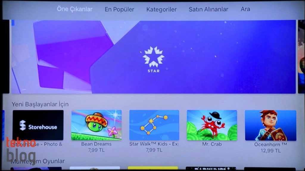 Türkiye’deki kullanıcılar açısından şu anda yeni Apple TV’yi en çekici kılan unsur uygulama ve oyun desteği olmalı. Apple TV’de yepyeni bir uygulama mağazası var. App Store bu sefer tvOS uygulamalarını Apple TV sahiplerine sunuyor. App Store’a baktığımızda henüz emekleme aşamasında olan bir platformun izlerini rahatlıkla görebiliyoruz. Uygulama katalogu sınırlı, sanki bir Windows’un uygulama mağazasını geziyormuş hissi veriyor. Ancak Apple’ın tvOS platformuna olan geliştirici ilgisi yüksek, kısa sürede daha fazla dikkate değer ve popüler uygulama Apple TV ile TV ekranlarına uyumlu hâle gelecektir.