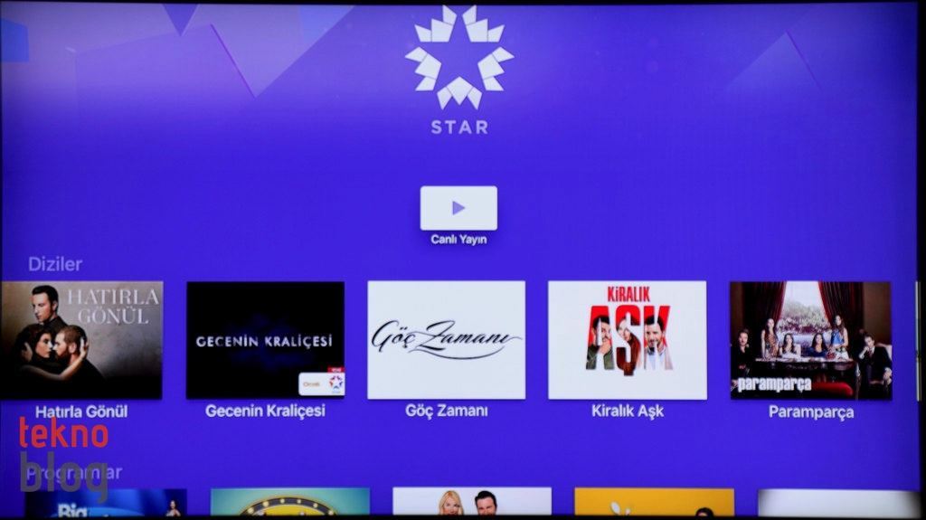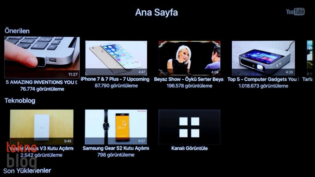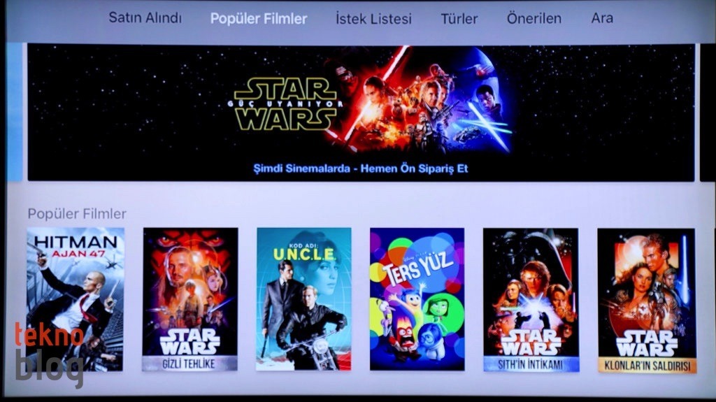 Kurulum işlemini kısa sürede tamamladıktan sonra artık yeni Apple TV’nin, yepyeni tvOS işletim sistemiyle çalışan kullanıcı arayüzü karşınıza çıkıyor. Aslına bakarsanız, genel şablon bakımından tvOS’in daha eski Apple TV’lerde gördüğümüz kullanıcı arayüzüne epey benzediğini görüyoruz. iTunes, Fotoğraflar, Müzikler yine ön planda ve siz hangisini seçerseniz, öne çıkarılan içerikler ekranın en üst bölümünde, manşet niteliğinde gösteriliyor. Arama özelliği biraz daha ön plana çıkarılmış ve saydığımız bu üç temel içerik grubunun yanına yerleştirilmiş.