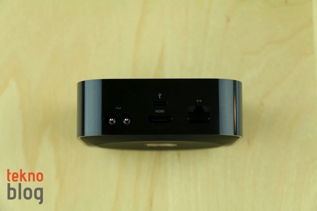Dördüncü nesil Apple TV şekil açısından daha önceki iki nesil Apple TV ürünlerinden fazla fark içermiyor. Karşımızda yine siyah renkli, kare şekilli, kenarları yuvarlatılmış küçük bir kutu var, ancak bu sefer boyu biraz daha uzun. Arka tarafta yine ethernet portu, HDMI çıkışı, güç konnektörü yer alıyor. Buna ek olarak bir de yeni eklenmiş USB-C portunu görüyoruz. Apple Retina ekranlı MacBook’un ardından ikinci bir ürününe bu yeni nesil portu eklemiş oluyor. Bu port sayesinde Apple TV’ye Mac bilgisayara bağlamak ve ekran görüntüsü alma ya da DRM kopya koruması olmayan kullanıcı arayüzü videolarını yakalama gibi işlevleri gerçekleştirebilirsiniz. Optik dijital ses çıkışı ise yeni nesil Apple TV’de yer almıyor.