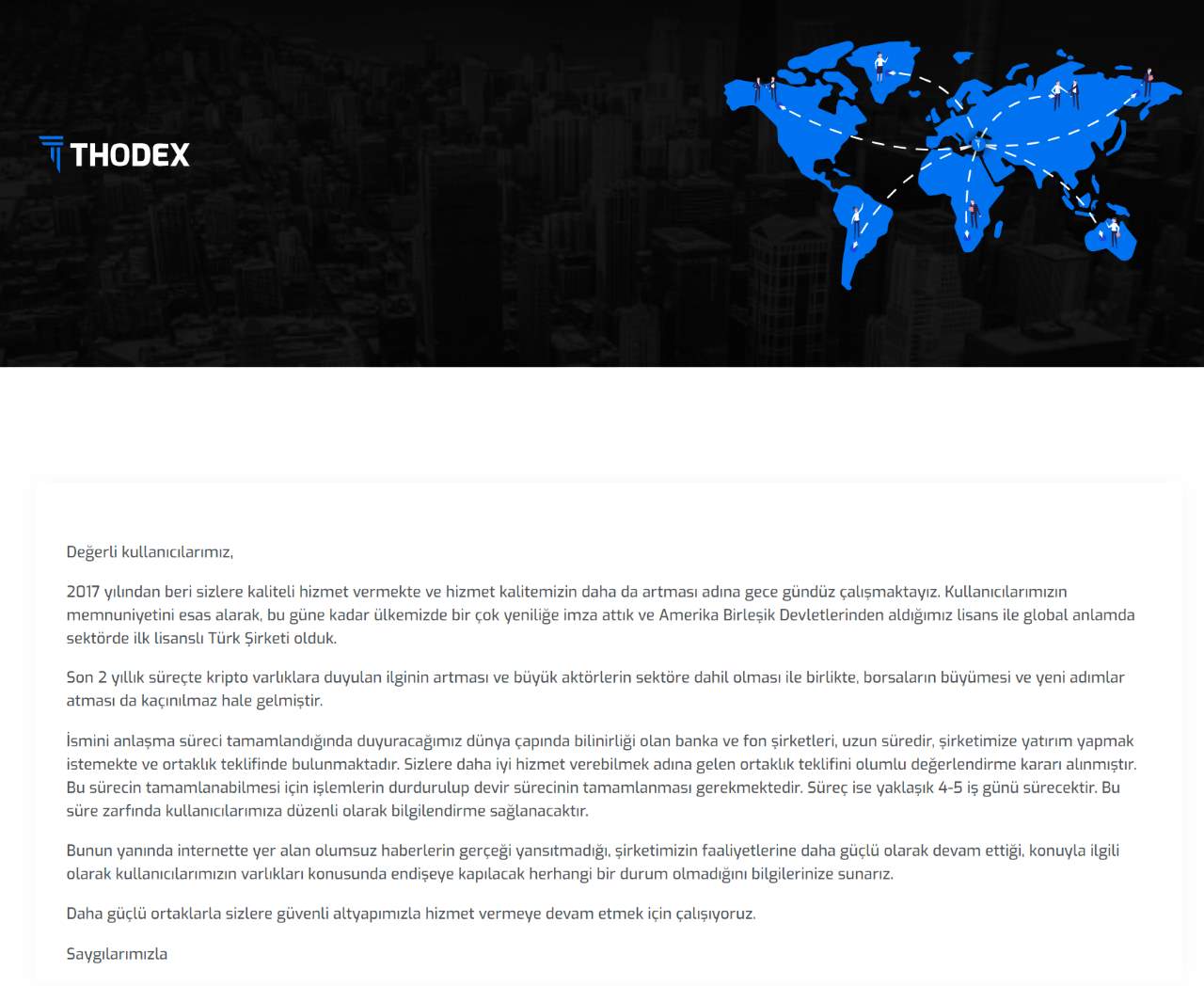 Thodex web sitesinde “Son 2 yıllık süreçte kripto varlıklara duyulan ilginin artması ve büyük aktörlerin; sektöre dahil olması ile birlikte, borsaların büyümesi ve yeni adımların atması da kaçınılmaz hale gelmiştir. İsmini anlaşma süreci tamamlandığında duyuracağımız; dünya çapında bilinirliği olan banka ve fon şirketleri; uzun süredir şirketimize yatırım yapmak istemekte ve ortaklık teklifinde bulunmaktadır. Sizlere daha iyi hizmet verebilmek adına gelen ortaklık teklifini olumlu değerlendirme kararı alınmıştır. Bu sürecin tamamlanabilmesi için işlemlerin durdurulup; devir sürecinin tamamlanması gerekmektedir. Süreç ise yaklaşık 4-5 iş günü sürecektir. Bu süre zarfında kullanıcılarımıza düzenli olarak bilgilendirme sağlanacaktır.” ifadesi yer alıyor.