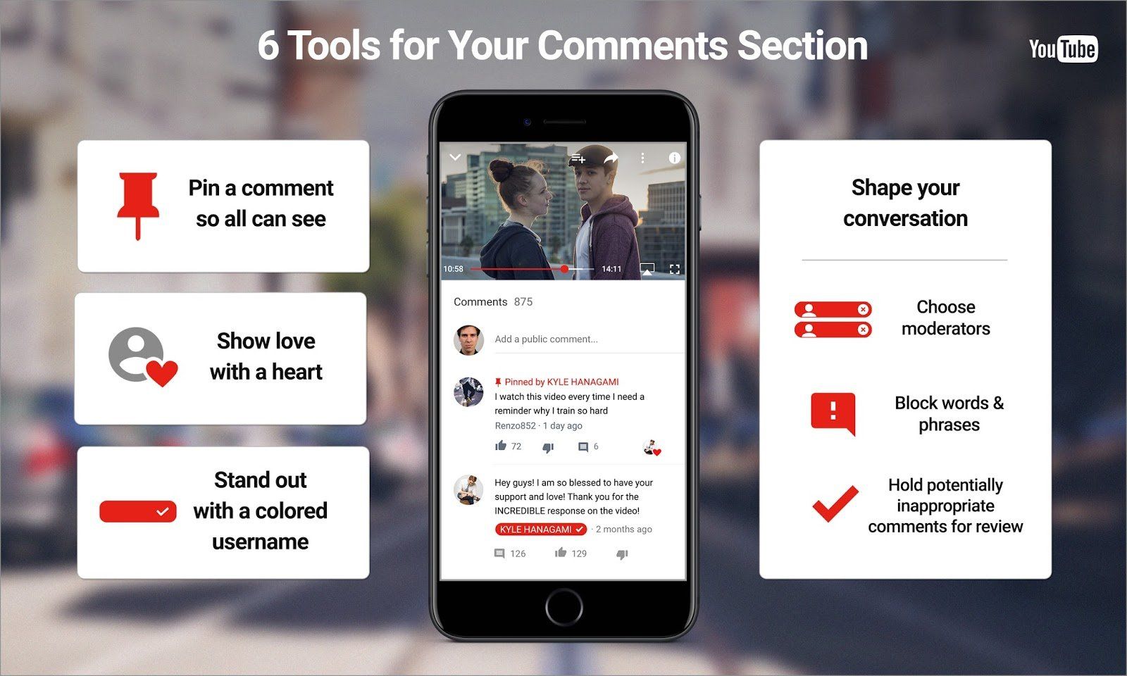 Artık içerik sahiplerine yorum yönetimi için altı farklı araç sunuluyor. Bu araçlardan üçünün yönetimden ziyade eğlence için geliştirildiği söylenebilir. YouTube, artık içerik sahiplerine beğendikleri bir yorumu yorum bölümünün en üstüne sabitleme izni veriyor. İçerik sahipleri artık beğendikleri yorumları da kalplerle işaretleyebilecek. Böylelikle içerik sahibinin beğenileri, diğer beğenilerden ayrılmış olacak. Kanal sahiplerinin yorumları da ayrı bir renkle gösterilecek.