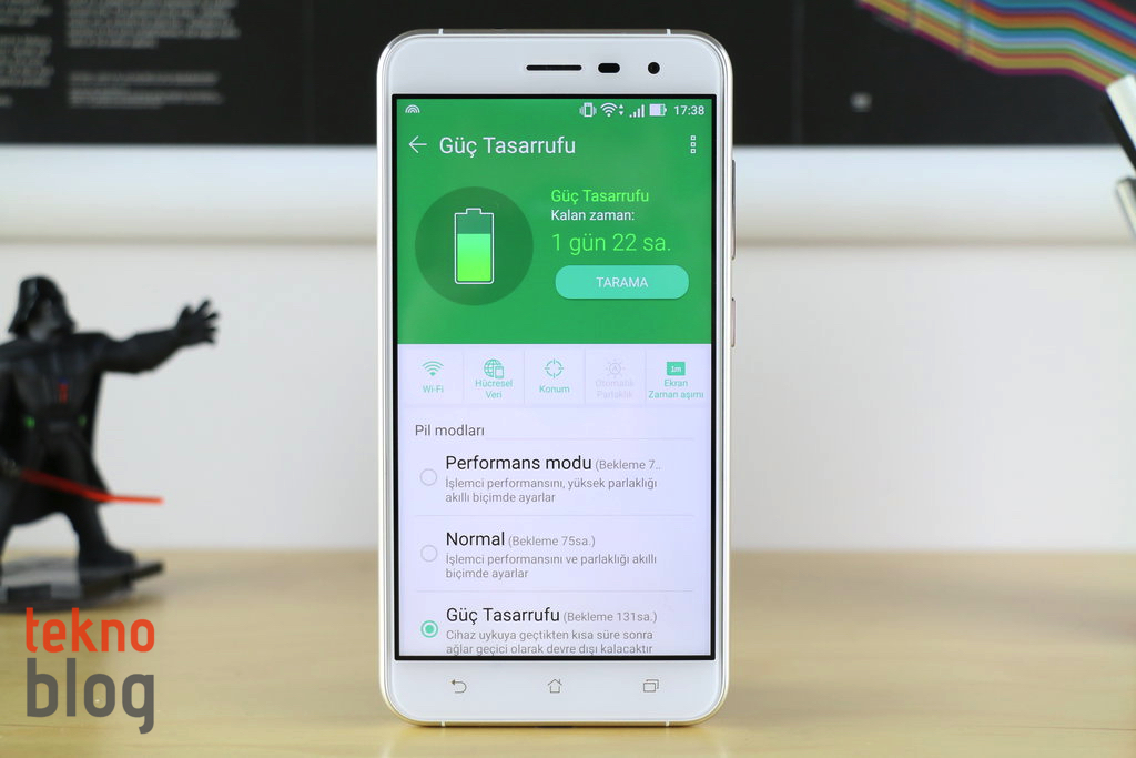 ZenFone 3’te yer alan 3000 mAh kapasiteli pil yerinden çıkarılamıyor. Normal yoğunluklu bir kullanımda bu telefon sabahtan akşama bir günü rahatlıkla çıkarıyor. Hatta aynı yoğunlukla kullanmaya devam ettiğinizde ertesi günün öğleden sonrasına da sizi taşımayı başaracaktır. Ancak YouTube’dan veya Netflix gibi kaynaklardan video izleme, 4K video kaydı, oyun oynama gibi telefonun ekranını ve işlemcisini daha fazla yoran senaryolarda ZenFone 3’ü gün içinde bir kez daha şarj etmek zorunda kalacaksınız.